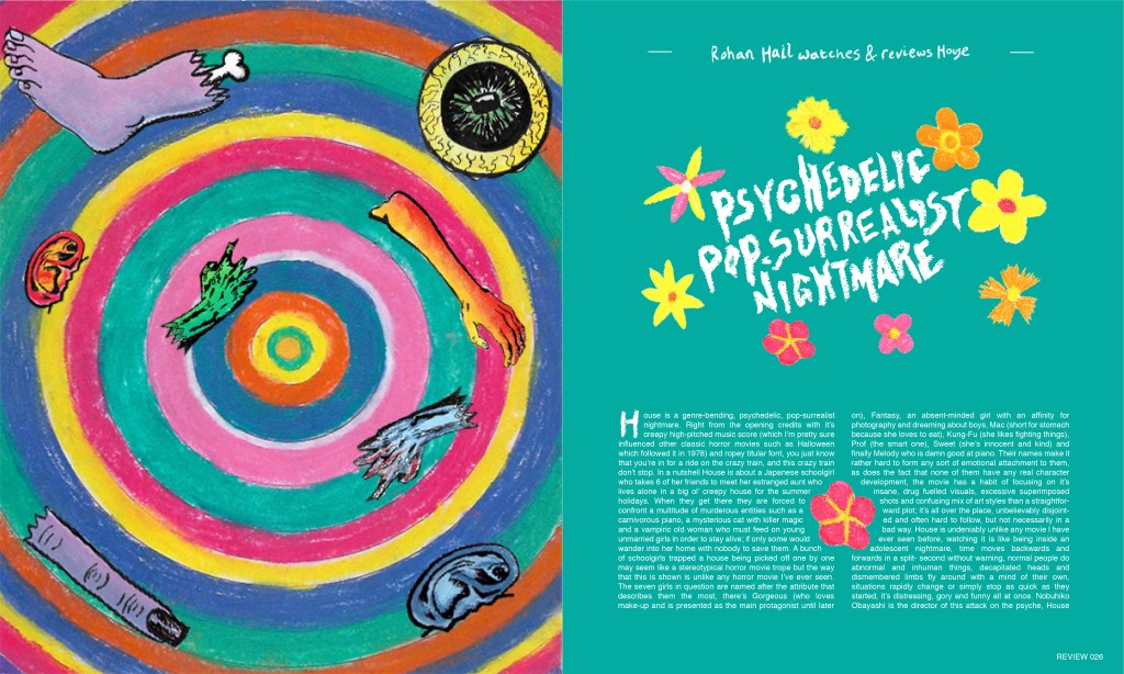 As far as the layout goes, I have decided that I want to have a full-page illustration on one page, with the text, headings, subheadings on the other page, with some other spot illustrations floating around the text. This is a similar layout to one used by Little White Lies in their Hidden Lives magazine issue and it inspired me quite a lot. For the full-page illustration, I was inspired by a particularly psychedelic scene in House where Kung-Fu is sucked through a lampshade and transported to some sort of weird, colourful dimension made up of colourful concentric circles. I decided to recreate this scene in my own way, having body parts swirling around in the vortex, rather than Kung-Fu because I feel as if using an entire person for a spot illustration would really blur the lines of what a spot illustration is supposed to be and wouldn’t really fit with how Little White Lies lays out their magazines.